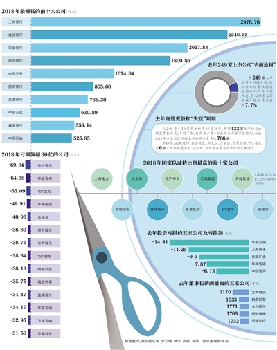 截至4月27日,已经披露年报的公司中有3235家上市公司。从利润来看,已经披露年报的公司中有2887家上市公司2018年度处于盈利状态,占已披露年报公司总数的89.2%,前十大最赚钱公司中银行业占7家,亏损王花落中兴通讯。