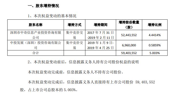 公司于2019年4月25日收到股东深圳市中奇信息产业投资咨询有限公司及其一致行动人中投发展(深圳)投资咨询有限公司出具的《告知函》,告知其已于2017年7月31日至2019年4月25日期间通过深圳证券交易所交易系统买入的公司股票达到5%。