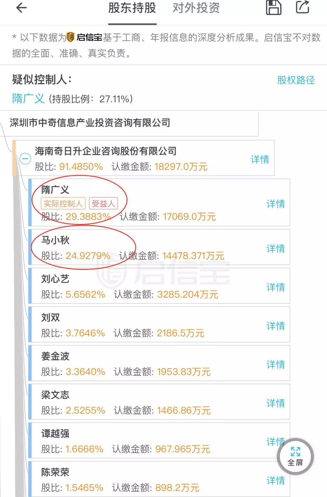 深圳中奇信息的控股股东为海南奇日升企业咨询股份有限公司,后者占股达91.4850%。