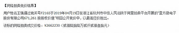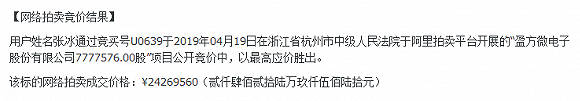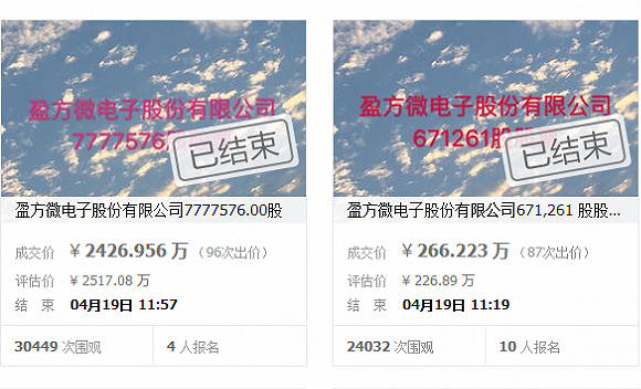 实际上去年ST盈方也发生过8笔拍卖,但都已流拍收工,投资者围观而不买,与这一次的结果迥然不同。通过阿里拍卖平台可以看到,上述的两笔拍卖发生在4月19日,在各自经历了数十次出价之后,盈方微电子的777.76万股成交价为2426.96万元,均价3.12元/股,胜出者为自然人张冰;陈志成被拍卖的67.13万股成交价格266.22万元,均价3.97元/股,胜出者姓名王强。两笔拍卖单价都低于ST盈方的现价4.32元/股,但即便如此,也显然没到掉以轻心的地步。