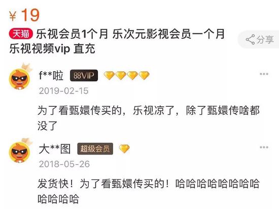 一个小插曲,尽管2018年乐视旗下的《后宫甄嬛传》版权易主给了优酷,但依旧有不明真相的群众通过淘宝购买了乐视会员,这几句评价或许是对乐视当年“内容为王”最好的注脚。