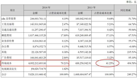2014年年报显示,终端成本取代内容投入,占据主营成本的70%以上。