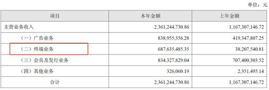 而在主营收入的结构中,也将过去高占比的付费会员收入与版权分销收入并到了一处,新增了终端业务收入一项。