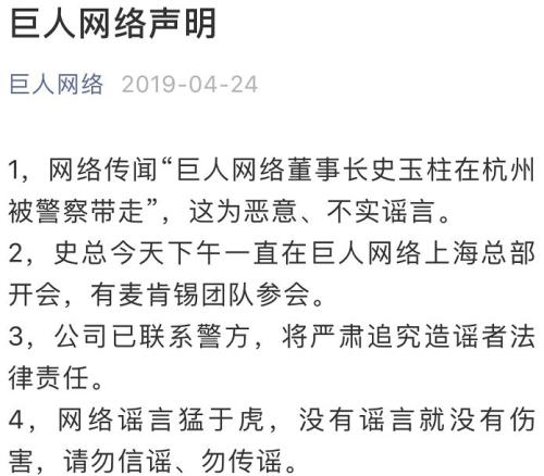 巨人网络也发布了官方声明称:网络传闻“巨人网络董事长史玉柱在杭州被警察带走”,这为恶意、不实谣言。公司已联系警方,将严肃追究造谣者法律责任。