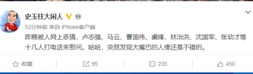 今日早间,史玉柱再次发微博称,昨晚被人网上恶搞,卢志强、马云、曹国伟、虞锋、林治洪、沈国军、张幼才等十几人打电话来慰问。