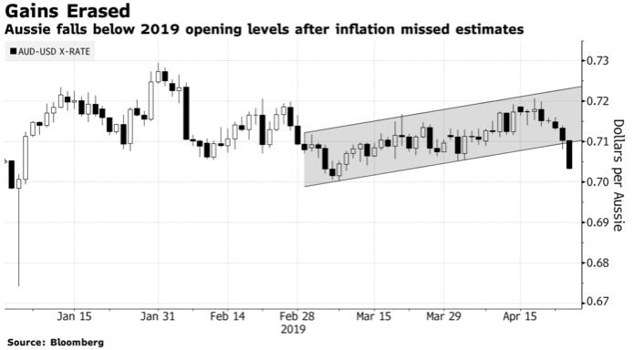 周三(4月24日)亚市盘中,澳元兑美元大跌近1%,现已刷新3月中旬以来最低位0.7031。时段内公布的澳洲一季度CPI数据逊于预期,令澳元多头惨遭重创。