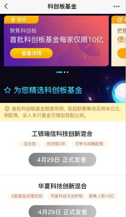 天天基金网也在平台主页面设置了“首批科创板基金”醒目推介,分别预告了华夏、汇添富、富国等6家科创基金的发售时间和产品特点,并提示“首批科创基金额度有限,若超额募集将采用末日比例配售,买入多只基金可增加获配比例”。