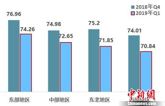 从区域来看,东部地区高于西部地区。一季度东部、中部、东北、西部的改革热度指数分别为74.26,72.65,71.85,70.84,比2018年第4季度均有所下降。其中,东北地区的降幅最大,达到4.45%。从连续八个季度评估结果来看,改革热度指数呈现出地域特征,东部地区最高,西部地区最低,两者之间的差距呈现不断缩小的趋势。
