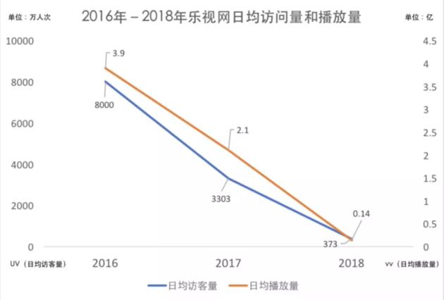乐视视频曾在影视版权库中拥有5万余部电影和10万部电视剧版权,一度占有视频业大半以上的版权内容。2016年时,网站日均访问量超8000万,到2018年,仅剩373万。网站的日均播放量更是从3.9亿跌落只剩1千多万。