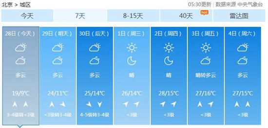 在阳光的助推下,今天开始北京的气温将坐上“直通车”一路升温,根本停不下来。今天到5月6日,白天的最高气温会在19℃-28℃,夜间最低气温会在9℃-16℃。这期间,北京的风力也总体不大,只在29日夜间到30日白天会有四五级北风,其余大部分时间都会是春风拂面。