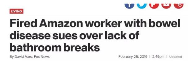 每经小编(微信号:nbdnews)注意到,就在今年2月,肯塔基州一位罹患慢性膀胱炎症的前员工愤怒地将亚马逊告上法庭,认为亚马逊克扣他正常上厕所的时间,因此索赔300万美元。