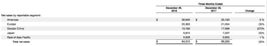 在2018年四季报中,苹果在大中华区的营收为131.69亿美元,较去年同期179.56亿美元下滑了27%。苹果在财报的注释中解释称,这主要源于iPhone在大中华区净销售额下降。与此同时,在各产品线净销售额中,iPhone也比去年同期下降15%,为其2007年推出后,在假日购物季度营收和利润的首次下降。