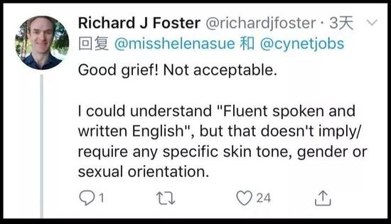 好悲伤!不能接受。我可以理解“流利的口语和书面英语,”但那不代表能直接或间接地要求任何特定的肤色、性别或性取向。