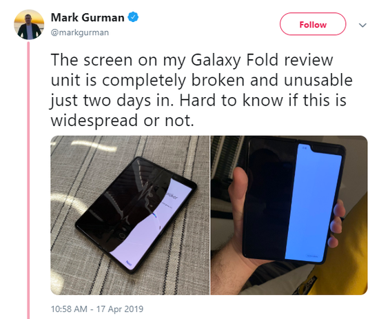 4 月 17 日,CNBC 作者 Steve Kovach 在 Twitter 上表示,在使用了一天之后,他手中的 Galaxy Fold 的折叠屏出现了闪屏和断屏的情况,屏幕中间出现断裂,最后屏幕的左侧部分完全变成一片黑暗,两天之后,这款手机完全不能使用——但是这款评测机没有去掉保护层。