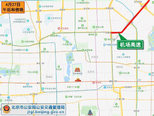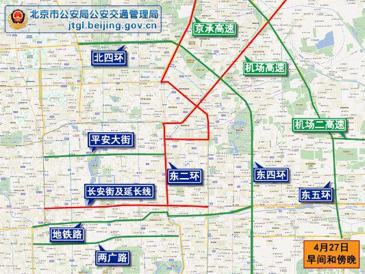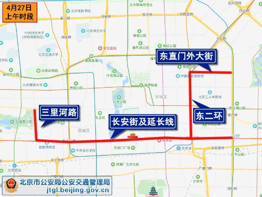 4月27日上午时段,长安街及其延长线、东二环、东外大街将频繁实施临时交通管制措施;