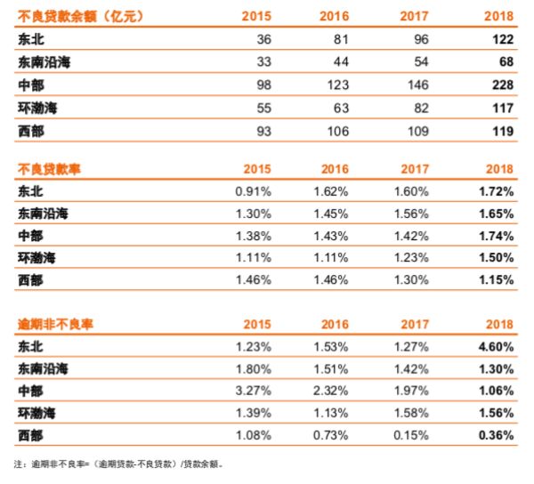 值得注意的是,在资产质量方面,城农商行的逾期贷款率、不良贷款率、逾期非不良率(即逾期贷款-不良贷款/贷款余额)分别为3.14%、1.54%、1.59%,均较2017年有所增长。具体到各地区,总体来看,东北地区资产压力较大,该地区逾期非不良率达4.6%,远高于其他地区。