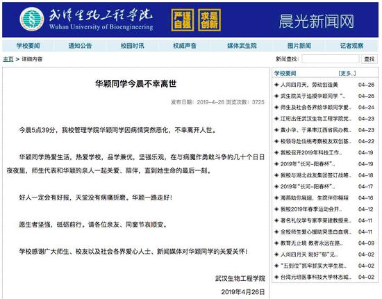 据武汉生物工程学院4月26日发布的消息,华颖同学不幸离世。