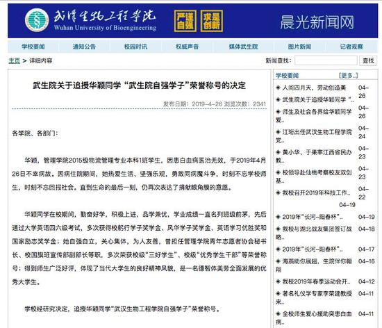 学校经研究决定,追授华颖同学“武汉生物工程学院自强学子”荣誉称号。