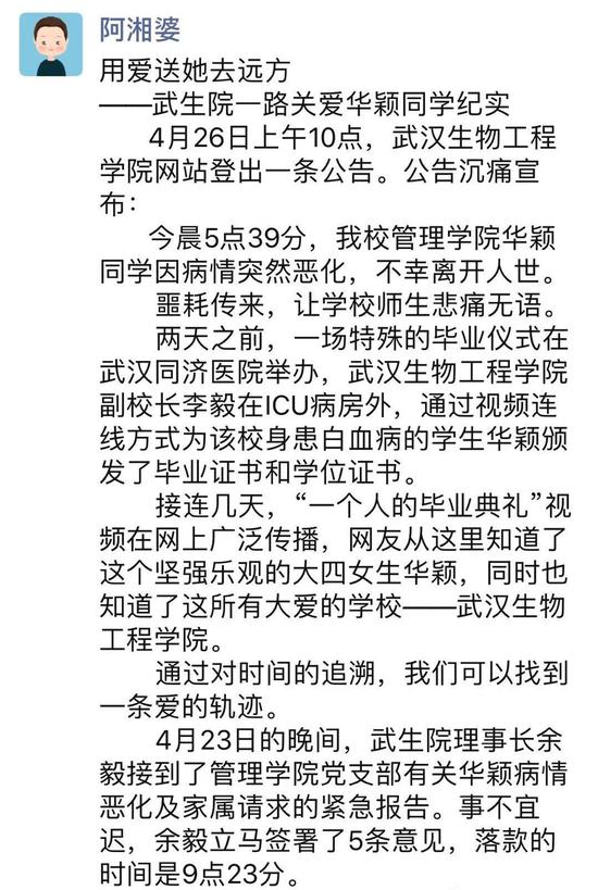 今晨5点39分,我校管理学院华颖同学因病情突然恶化,不幸离开人世。