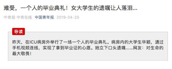 4月24日,患白血病的大四学生华颖,在ICU通过手机视频连线,完成了学校为她提前举办的毕业典礼。