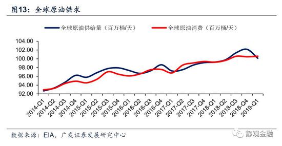 根据美国能源署(EIA)的数据,2019年1Q全球原油供给量100.13百万桶/天,需求量100.59百万桶/桶。不仅逆转了2018年2H全球原油供给过剩的局面,甚至还出现了0.46百万桶/天的供给缺口。图13所示,尽管需求相对强劲,但2019年1Q供需结构的变化主因来自供给下滑。