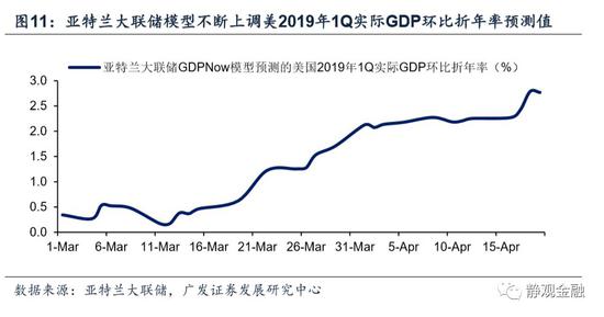 图11所示,3月以来美国亚特兰大联储GDP Now模型不断上调美国2019年1Q实际GDP环比折年率预测值,目前该预测结果已有3月初的0.3%调高至2.8%(4月19日预测结果)。表明一季度美国高频数据也在不断超预期。
