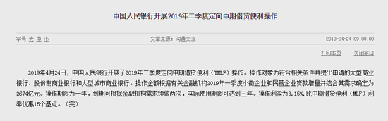 新浪财经讯 4月24日消息,中国人民银行开展了2019年二季度定向中期借贷便利(TMLF)操作。操作对象为符合相关条件并提出申请的大型商业银行、股份制商业银行和大型城市商业银行。操作金额根据有关金融机构2019年一季度小微企业和民营企业贷款增量并结合其需求确定为2674亿元。操作期限为一年,到期可根据金融机构需求续做两次,实际使用期限可达到三年。操作利率为3.15%,比中期借贷便利(MLF)利率优惠15个基点。