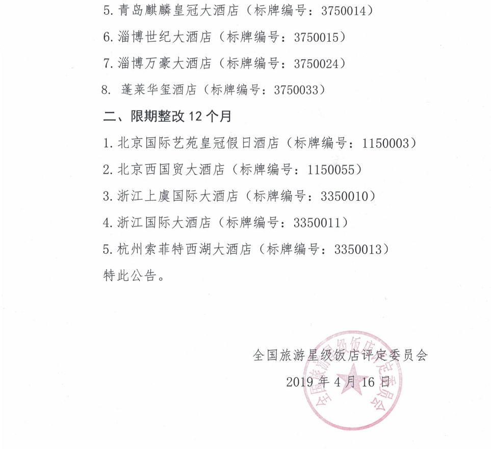 4月21日,全国旅游星级饭店评定委员会发布2019年第3号公告,8家饭店被取消五星级旅游饭店资格,5家饭店被要求限期整改12个月。