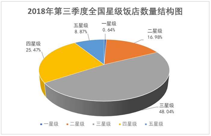 文化和旅游部2019年2月发布的2018年第三季度全国星级饭店统计公报显示,2018年第三季度,共有9230家星级饭店通过省级文化和旅游行政部门审核,包括其中一星级59家,二星级1567家,三星级4434家,四星级2351家,五星级819家。