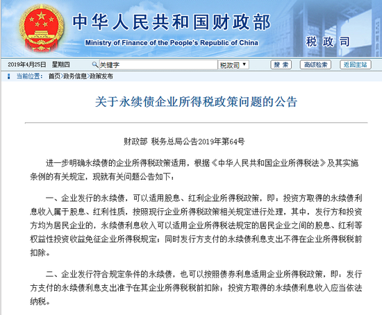 财政部表示,进一步明确永续债的企业所得税政策适用,根据《中华人民共和国企业所得税法》及其实施条例的有关规定,就有关问题作出公告,其中包括企业发行的永续债,可以适用股息、红利企业所得税政策;企业发行符合规定条件的永续债,也可以按照债券利息适用企业所得税政策。