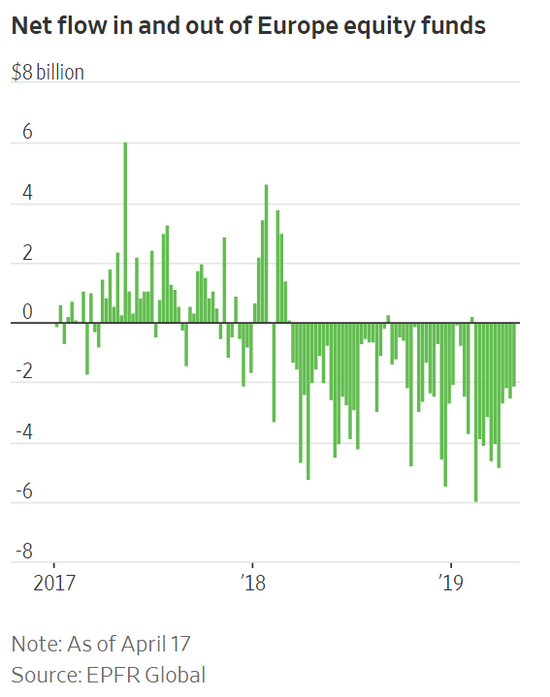 美银美林最新的全球基金经理调查显示,与过去相比,英国和欧元区股票是投资者最不看好的资产。资金流动数据提供商EPFR的数据显示,过去一年,欧洲股票基金除了两周外,其它所有时间都面临净撤资。