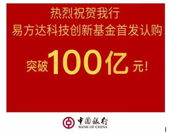 中国银行发布了热烈祝贺易方达科创基金首发认购突破“100亿”的大红喜报,该只基金也为首批科创基金热销拿下“开门红”。
