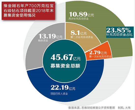 截至2016年,豫金刚石实际共向特定投资者募集资金净额45.67亿元,其中补充流动性资金2.79亿。如果再计入前述2018年12月21日被公告变更用途的8.1亿,前后共计有10.89亿元被补充流动性资金,占总募集资金23.85%。