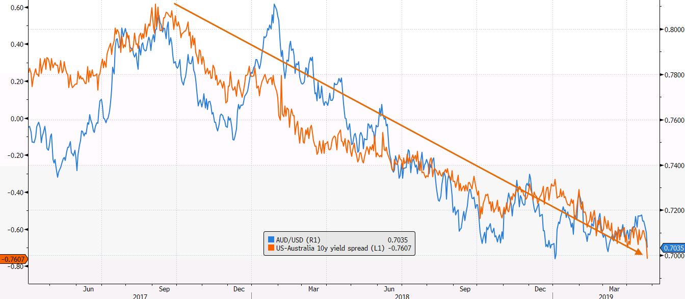 如上图所示,自2017年下半年以来,澳元/美元走势便主要受到了两国国债收益率的影响。随着日内的数据验证澳洲联储可能在未来几个月降息,而美联储仍可能处于观望状态,两者的国债收益率差可能进一步走阔,并对澳元形成下行压力。