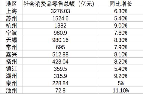 从城市的角度来看,统计发现,目前已经公布数据的长三角城市共有12个。从社会消费品零售额增速的角度比较,12城中,有8个城市增速低于全国平均水平,11个城市增速均低于10%。