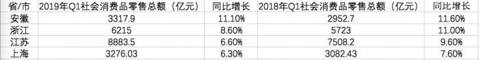 除此之外,对比2018年一季度和2019年一季度的同期数据可以发现,2018年一季度安徽省社会消费品零售总额为2952.7亿元,彼时还位列三省一市中最低。但到了2019年一季度,安徽省社会消费品零售总额超越上海41.87亿元,以“微弱优势”实现了对上海的“超车”。