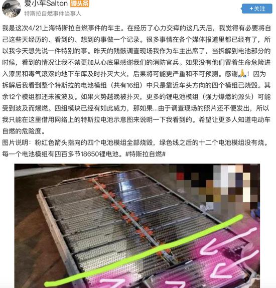 鞭牛士 4月26日消息,今日,关于特斯拉汽车在地下车库自燃起火一事,自燃车车主发文称:(车辆)拆解后我看到整个特斯拉的电池模组(共有16组)中只是靠近车头方向的四个模组已烧毁。其余12个模组都还未被波及。如果火势越晚被扑灭,更多的锂电池模组(强力爆燃的源头)可能受到波及而爆燃。