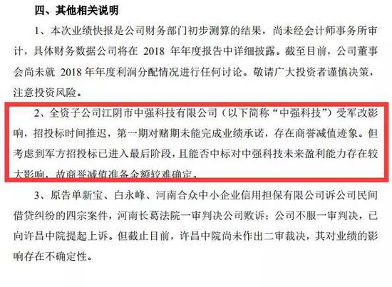 全资子公司江阴市中强科技有限公司受军改影响,招投标时间推迟,第一期对赌期未能完成业绩承诺,存在商誉减值迹象。但考虑到军方招投标已进入最后阶段,且能否中标对中强科技未来盈利能力存在较大影响,故商誉减值准备金额较难确定。