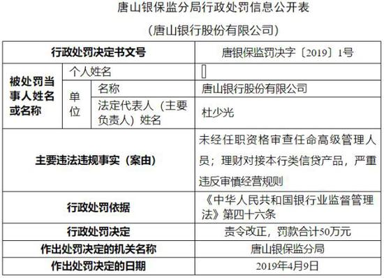 新浪财经讯 4月26日消息, 银保监会网站今日公布的唐山银保监分局行政处罚信息公开表,唐山银行股份有限公司存在未经任职资格审查任命高级管理人员;理财对接本行类信贷产品,严重违反审慎经营规则两宗违法行为。唐山银保监分局责令其改正,并处以罚款合计50万元。