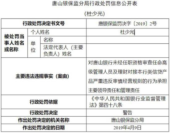 杜少光对唐山银行未经任职资格审查任命高级管理人员及理财对接本行类信贷产品严重违反审慎经营规则的行为承担主要领导责任和管理责任。唐山银保监分局对其予以警告。