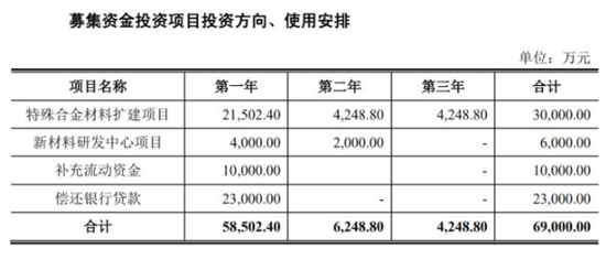 此外,招股说明书显示,该公司此次拟发行不超过4180万股,募集资金共计6.9亿元。其中,拟投资3亿元购置国内外先进设备,建设特殊合金产品生产线,2.3亿元偿还银行贷款,1亿元补偿流动资金,另有6000万元投资新材料研发中心项目。
