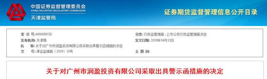 天津证监局表示,上述行为违反了《上市公司收购管理办法》第十三条、《上市公司监管指引第4号——上市公司实际控制人、股东、关联方、收购人以及上市公司承诺及履行》(证监会公告〔2013〕55号,以下简称《监管指引》)第六条的规定,根据《上市公司收购管理办法》第七十五条、《监管指引》第六条规定,现对广州市润盈投资有限公司一并采取出具警示函的监督管理措施。
