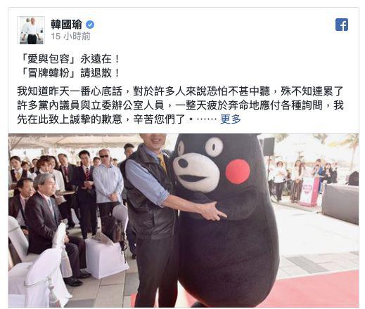 高雄市长韩国瑜4月23日发表“现行制度下无法参加国民党初选”的声明后,外界褒贬评论都有,24日晚间韩国瑜又在脸书发文,以“爱与包容永远在,冒牌韩粉请退散”为题倾诉心声。他说,冒牌韩粉近日在网上愈发变本加厉,不仅成功分化了蓝营团结、制造仇恨,也为他树立了不少敌人,所以他衷心希望所有人能齐心一起抓出“假韩粉”,让这些冒牌货无所遁形,并称“没有爱与包容,谁又赢得了2020?”