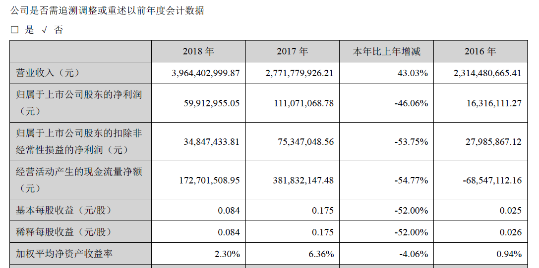 2018年,黑芝麻完成营业收入39.64亿元(非含税),比上年同期增长43.03%;实现归属于上市公司股东的净利润5991.3万元,较上年同期下降46.06%;实现扣除非经常性损益的净利润3484.74万元,较上年同期下降53.75%。