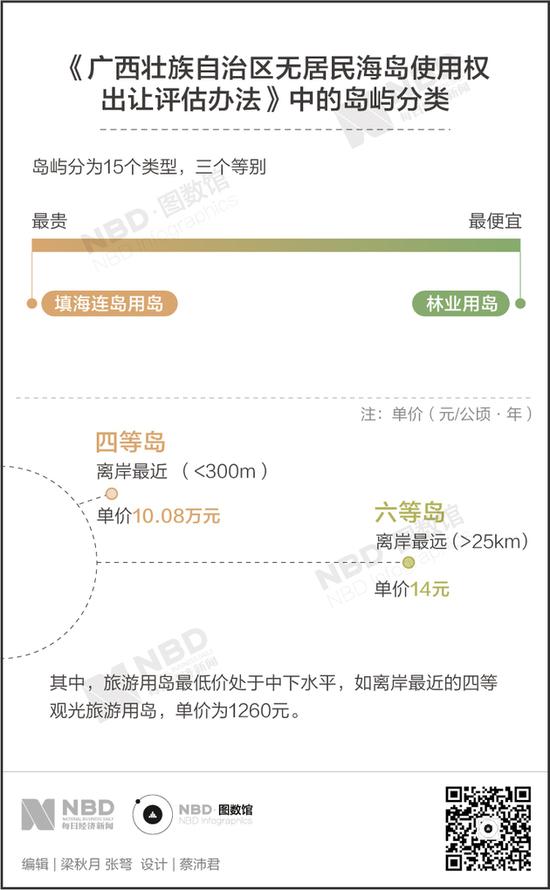 但也并不是所有岛屿都如此昂贵,在2014年出台的《广西壮族自治区无居民海岛使用权出让评估办法》中,有的岛屿的单价(元/公顷?年)却只有14元,仅相当于一顿工作餐的价格。