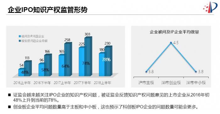 “科创板虽然还没有企业正式上市交易,但前段时间我们对主板、中小板和创业板企业上市中的知识产权问题状况作了调查统计,被证监会反馈知识产权问题意见的上市企业从2016年初48%上升到当前的78%,说明证监会越来越关注IPO企业的知识产权问题。另外,创业板企业平均问题数量高于主板和中小板,这也预示了科创板IPO企业的问题数量可能会更多。”4月27日,国家知识产权局知识产权发展研究中心主任韩秀成表示。