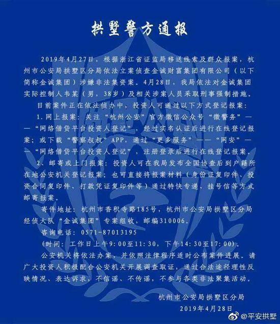 据杭州市公安局拱墅区分局通报,4月27日,根据浙江省证监局移送线索及群众报案,杭州市公安局拱墅区分局依法立案侦查金诚财富集团有限公司(以下简称金诚集团)涉嫌非法集资案。4月28日,杭州市公安局拱墅区分局依法对金诚集团实际控制人韦某(男,38岁)及相关涉案人员采取刑事强制措施。