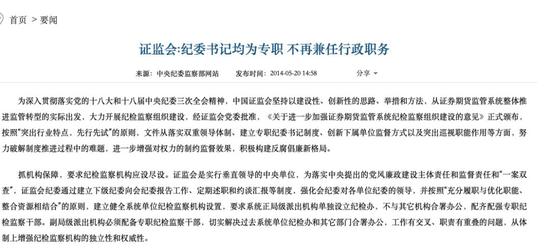 当年5月,中央纪委刊发了一篇名为《证监会:纪委书记均为专职 不再兼任行政职务》的文章,引起广泛关注。