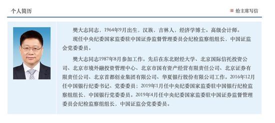 仅3个月后,樊大志转岗,任中央纪委国家监委驻证监会纪检监察组组长。