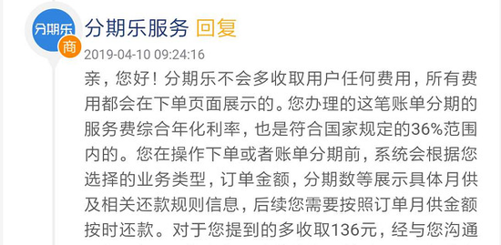 对此,分期乐工作人员回复称,“分期乐不会多收取用户任何费用,所有费用都会在下单页面展示,您办理的这笔帐单综合年化费率符合国家规定的36%范围以内。”